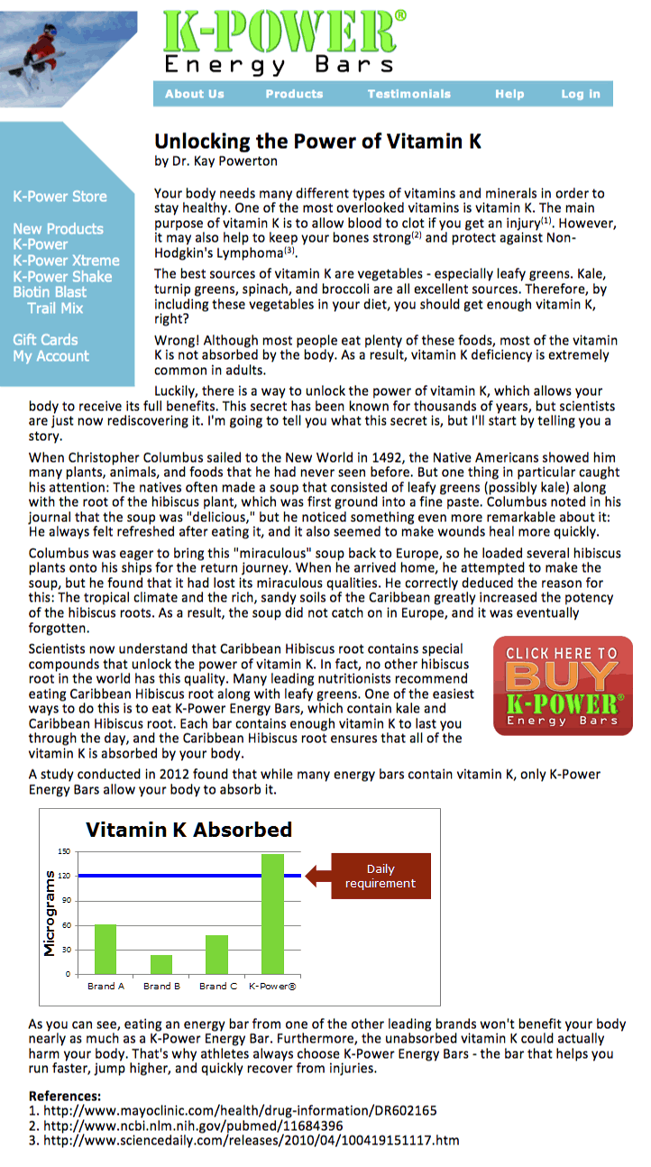 There is clearly a problem with this article, as it seems that the author has fabricated information to get people to buy K-Power Energy Bars. While it's possible that these energy bars are a quality product, you probably shouldn't believe anything the article says about vitamin K or Caribbean Hibiscus root. Although some of the article is true and cites credible sources, it would be best to go directly to those sources to get more trustworthy information. Overall, this article is probably not objective or reliable.