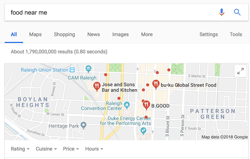 Including the phrase near me in your searches can provide all sorts of information. Just type something like food near me , coffee near me , or gas near me , and Google will look for nearby examples. Even a phrase like cool places near me delivers unique results, so don’t hesitate to try new ideas.