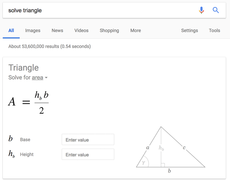 If geometry is giving you trouble, type solve along with a shape such as triangle or rectangle . This will bring up the geometry calculator , from which you can solve for numerous aspects of a shape.