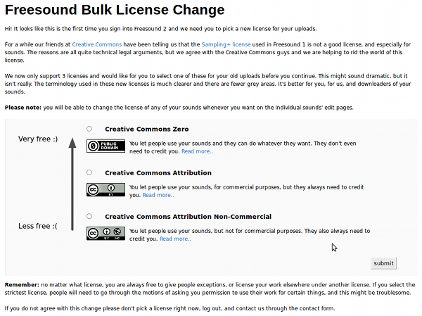 A large fraction (37%) of the community also wanted a public domain option (and fortunately we launched the CC0 public domain dedication in the interim). The image below shows what the Freesound 2.0 license migration options look like for existing users: