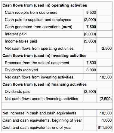 • Financing activities include the inflow of cash from investors, as well as the outflow of cash to shareholders as dividends as the company generates income. Other activities which impact the long-term liabilities and equity of the company are also listed in the financing activities.