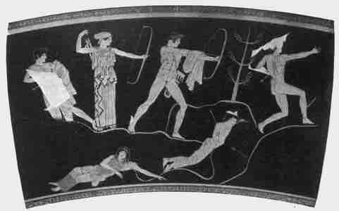 Niobid Painter. Artemis and Apollo Slaying the Children of Niobe. Athenian red-figure calyx krater. c. 450 BCE. Orvieto, Italy.