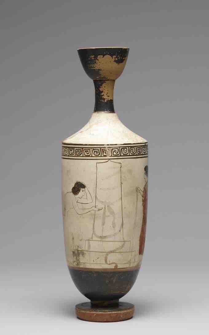 The Achilles Painter, a pupil of the Berlin Painter and creator of both red-figure and white-ground vessels, is one of the most well-known white ground painters. The scenes he painted on his white-ground lekythoi are filled with pathos and sorrow, often depicting women sitting in front of grave stelae or bidding their battle-bound husbands farewell.