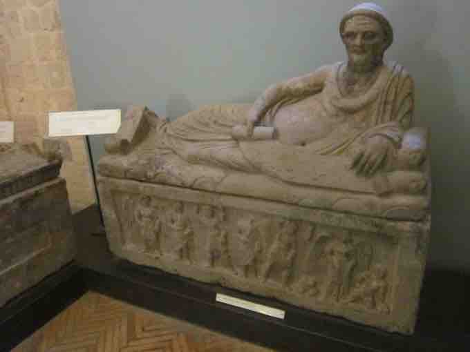 The lid of the sarcophagus depicts a portrait of the deceased. The man lies alone, wearing a somber expression, unlike the earlier terra cotta Sacophagus of the Spouses. His face is wrinkled and reflects a Roman republican portrait style, which equates age with wisdom and leadership capabilities. He has a pot belly, signifying his wealth, good life, and robust eating, and he holds a scroll across his lap that is inscribed with a list of his accomplishments.