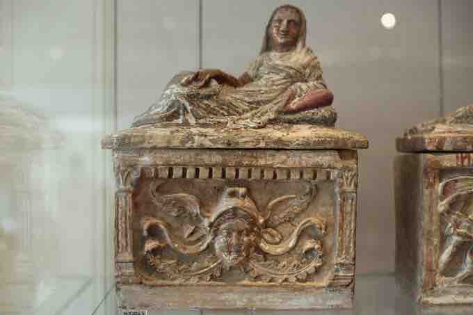Smaller cinerary urns assumed the shapes of sarcophagi during this period. These urns are topped with images of the deceased lying across the lid, often in Roman dress, with relief-carved scenes of battle, violence, or Charun and Vanth. The woman who reclines atop the urn wears attire more akin to that of a Roman matron than to the woman on the Sarcophagus of the Spouses. Unlike the Etruscans, who buried their dead in tombs designed to mimic the appearance and comforts of private homes, the Romans practiced cremation and stored the ashes of their deceased in cinerary urns. This shift in Etruscan culture demonstrates the adoption of Roman funerary practices.