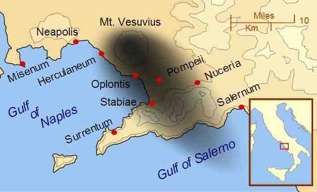 During the Roman Republic and into the early Empire, the area today known as the Bay of Naples was developed as a resort-type area for elite Romans escaping the pressure and politics of Rome. The region was dominated by Mt. Vesuvius, which famously erupted in August 79 CE, burying and preserving the cities of Herculaneum, Pompeii, along with the region's villas and farms. While today the cities of Pompeii and Herculaneum are often described as cities frozen in time, the inhabitants of these cities and the region around Vesuvius had many warnings prior to the eruption that something was about to happen. A major earthquake shook the region in 62 CE, causing damage to buildings that still had not been repaired by the time of volcano's eruption seventeen years later. In the days leading up to the eruption the number of tremors became more frequent. While not everyone left prior to the eruption, archaeological evidence shows that people did leave the city. Some houses give the impression of having been packed up and in some cases furniture and objects were excavated jumbled together. Other objects of value appear to have been buried or hidden. There is evidence of people returning after the eruption to dig through the remains—either recovering lost goods or looting for valuables.