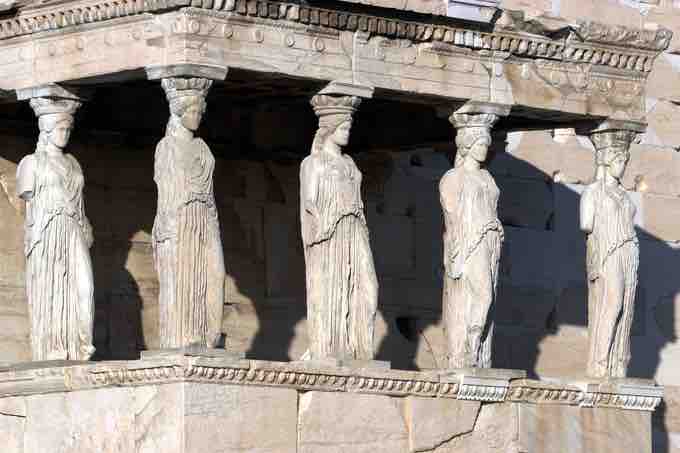 A porch on the south side of the Erechtheion is known as the Porch of the Caryatids, or the Porch of the Maidens. Six towering sculpted women (caryatids) servesupport the entablature of the building. The women replace columns, yet look columnar themselves. Their drapery, especially over their weight-bearing leg, is long and linear, creating a parallel to the fluting on an ionic column. While they stand in similar poses, each statue has its own stance, facial features, hair, and drapery. They carry egg-and-dart capitals on their heads, much as women throughout history have carried baskets. Between their heads and this capital is a sculpted cushion, which gives the appearance of softening the load of the weight of the building.