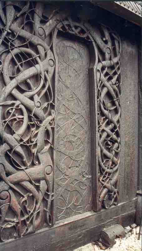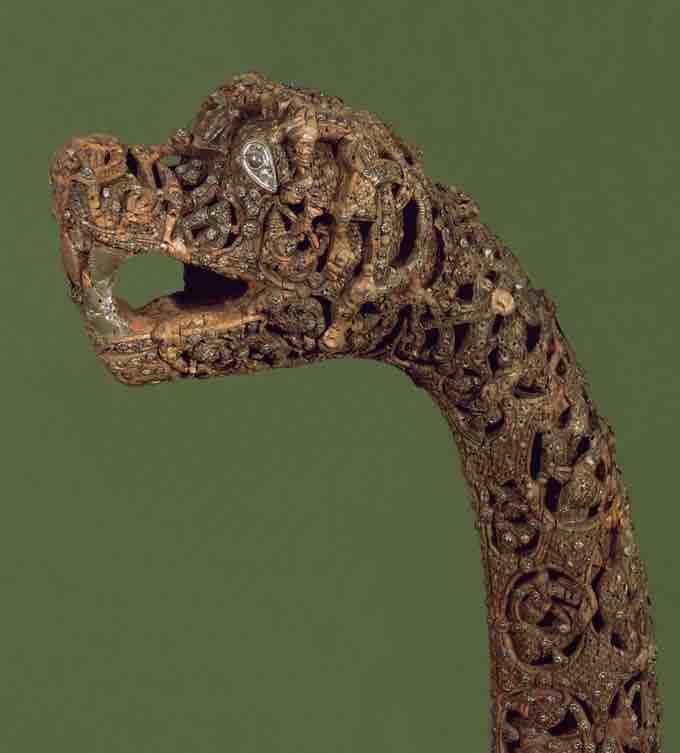 Carved detail from the back bow of the Oseberg ship. The Oseberg Bow demonstrates the Norse mastery of decorative wood carving.
