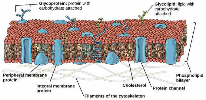 The cell membrane is an extremely pliable structure composed primarily of two adjacent sheets of phospholipids. Cholesterol, also present, contributes to the fluidity of the membrane. A single phospholipid molecule consists of a polar phosphate "head," which is hydrophilic, and a non-polar lipid "tail," which is hydrophobic. Unsaturated fatty acids result in kinks in the hydrophobic tails. The phospholipid bilayer consists of two phospholipids arranged tail to tail. The hydrophobic tails associate with one another, forming the interior of the membrane. The polar heads contact the fluid inside and outside of the cell .