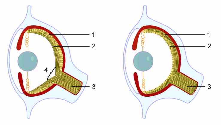 Vertebrates and octopi developed the camera eye independently. In the vertebrate version the nerve fibers pass in front of the retina, and there is a blind spot (4) where the nerves pass through the retina. In the octopus version, the eye is constructed the "right way out," with the nerves attached to the rear of the retina. This means that octopi do not have a blind spot.
