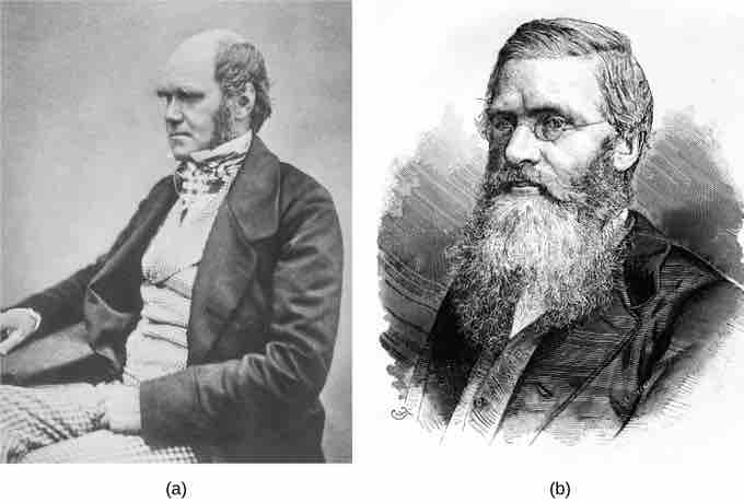 Both (a) Charles Darwin and (b) Alfred Wallace wrote scientific papers on natural selection that were presented together before the Linnean Society in 1858.