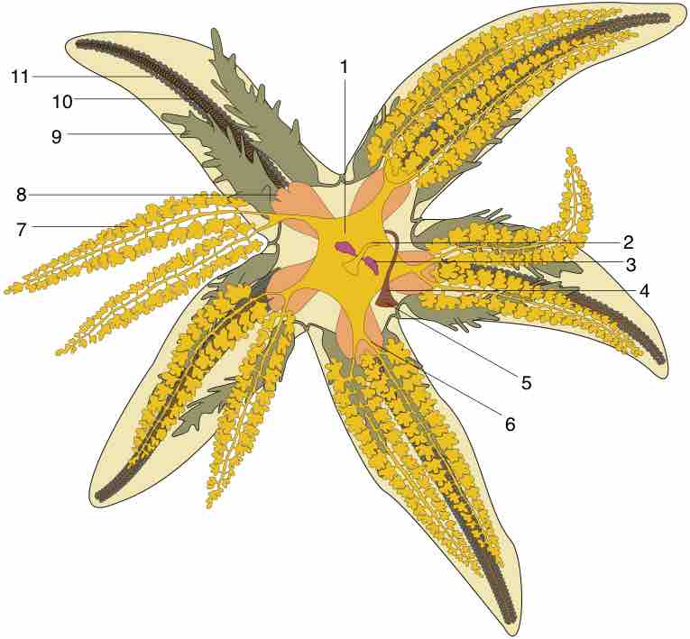 1. Pyloric stomach 2. Intestine 3. Rectal gland 4. Stone canal 5. Madreporite 6. Pyloric duct 7. Pyloric cecum 8. Cardiac stomach 9. Gonad 10. Ambulacral plates 11. Ampullae