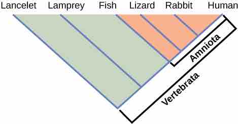 Lizards, rabbits, and humans all descend from a common ancestor that had an amniotic egg. Thus, lizards, rabbits, and humans all belong to the clade Amniota. Vertebrata is a larger clade that also includes fish and lamprey.