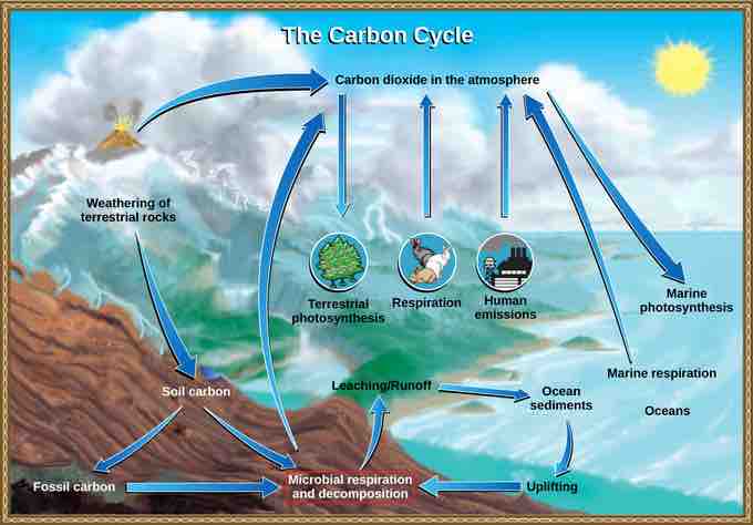 Carbon is one of the most important macronutrients. Prokaryotes play an important role in the carbon cycle . Carbon is cycled through earth's major reservoirs: land, the atmosphere, aquatic environments, sediments and rocks, and biomass. The movement of carbon is via carbon dioxide, which is removed from the atmosphere by land plants and marine prokaryotes and is returned to the atmosphere via the respiration of chemoorganotrophic organisms, including prokaryotes, fungi, and animals. Although the largest carbon reservoir in terrestrial ecosystems is in rocks and sediments, that carbon is not readily available.