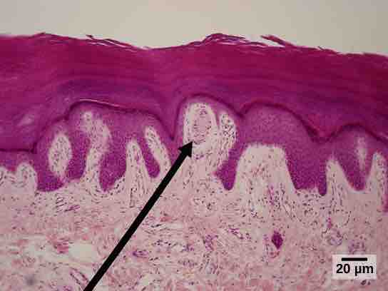 Meissner corpuscles in the fingertips, such as the one viewed here using bright field light microscopy, allow for touch discrimination of fine detail.