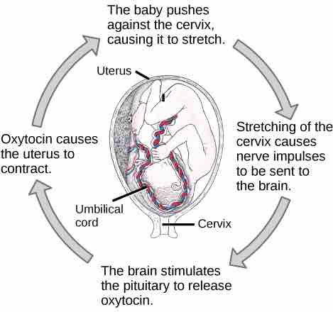 A positive feedback loop maintains the direction of the stimulus and possibly accelerates it. There are few examples of positive feedback loops that exist in animal bodies, but one is found in the cascade of chemical reactions that result in blood clotting, or coagulation. As one clotting factor is activated, it activates the next factor in sequence until a fibrin clot is achieved. The direction is maintained, not changed, so this is positive feedback. Another example of positive feedback is uterine contractions during childbirth. The hormone oxytocin, made by the endocrine system, stimulates the contraction of the uterus. This produces pain sensed by the nervous system. Instead of lowering the oxytocin and causing the pain to subside, more oxytocin is produced until the contractions are powerful enough to produce childbirth .