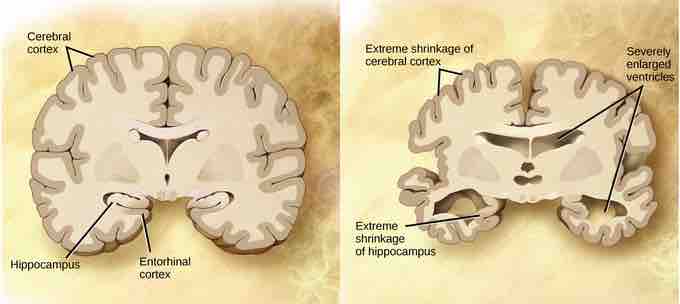 Compared to a normal brain (left), the brain from a patient with Alzheimer's disease (right) shows a dramatic neurodegeneration, particularly within the ventricles and hippocampus.
