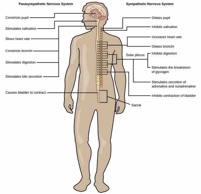 While the sympathetic nervous system is activated in stressful situations, the parasympathetic nervous system allows an animal to "rest and digest." One way to remember this is to think that during a restful situation like a picnic, the parasympathetic nervous system is in control ("picnic" and "parasympathetic" both start with "p"). Parasympathetic preganglionic neurons have cell bodies located in the brainstem and in the sacral (toward the bottom) spinal cord. The axons of the preganglionic neurons release acetylcholine on the postganglionic neurons, which are generally located very near the target organs.