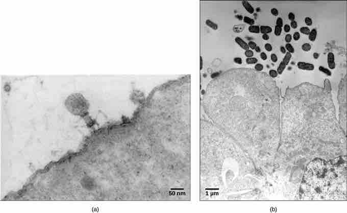 In these transmission electron micrographs, (a) a virus is dwarfed by the bacterial cell it infects, while (b) these E. coli cells are dwarfed by cultured colon cells.