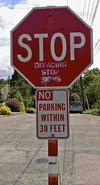 A stop sign ironically defaced with a beseechment not to deface stop signs