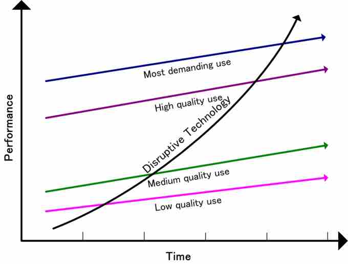 Disruptive innovations rapidly improve the overall performance (fulfillment of the user's needs) in a fraction of the time normally required to improve organically through efficiency. Netflix disrupted the movie and TV market through rapidly improving the experience in a short amount of time.