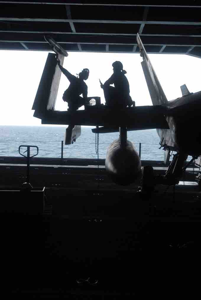Here, two aviation structural mechanics are collaborating on the wing of a F/A-18C Hornet, performing routine maintenance in the hangar bay. TQM practices ensure each person involved with a product is responsible for its quality.