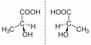 S-Lactic acid and R-Lactic acid are depicted on the left and right, respectively. They share the same formula and bond connectivity, but are nonsuperimposable mirror images of one another.