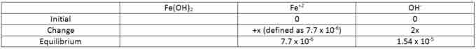 The solubility of Fe(OH)2 is 7.7 x 10-6 M, this is equal to the value of the change (x) in the table.