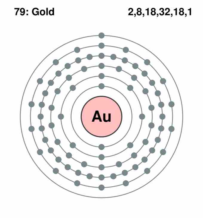 The figure shows the organization of the electrons around the nucleus of a gold (Au) atom. Notice that the first energy level (closest to the nucleus) can have only two electrons, while more electrons can 'fit' within a given level further out. The number of electrons in each level is listed on the upper right corner of the figure. Notice that the outermost level has only one electron.