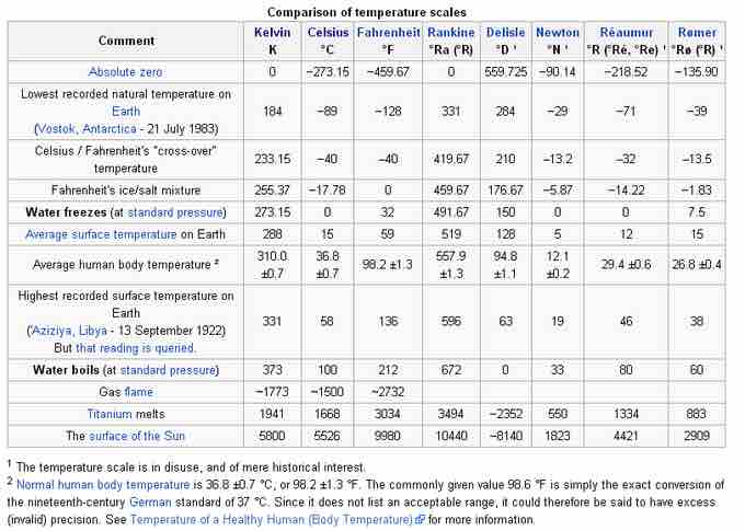 A comparison of temperature scales table illustrates a variety of temperature scales, some of which are no longer used. It is interesting to see the temperatures of commonly occurring events over these scales, and to imagine the great hurdles that were overcome in developing modern thermometry.