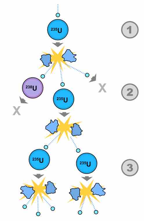 A possible nuclear fission chain reaction. In the first step, a uranium-235 atom absorbs a neutron, and splits into two new atoms (fission fragments), releasing three new neutrons and a large amount of binding energy. In the second step, one of those neutrons is absorbed by an atom of uranium-238, and does not continue the reaction. Another neutron leaves the system without being absorbed. However, one neutron does collide with an atom of uranium-235, which then splits and releases two neutrons and more binding energy. In the third step, both of those neutrons collide with uranium-235 atoms, each of which splits and releases a few neutrons, which can then continue the reaction.