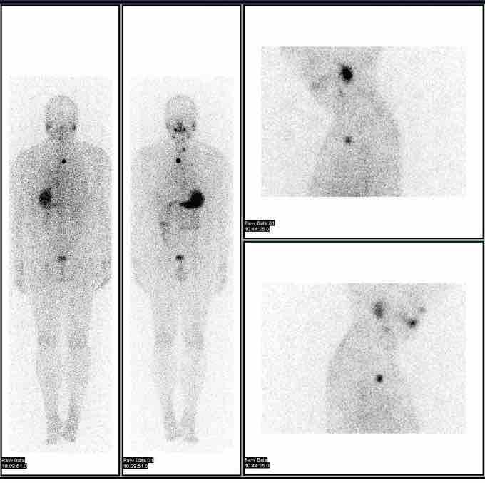 These images are scans used in the evaluation of thyroid cancer using the isotope iodine-123.