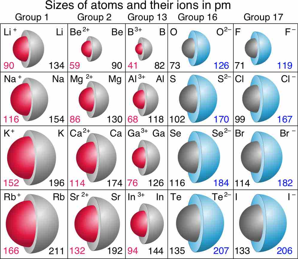 Red numbers are ionic radii of cations, black numbers are for neutral species, and blue numbers are for anions.