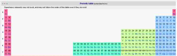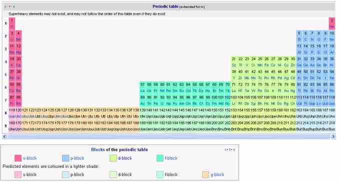 The periodic table with all groups and periods in place. The placement of the undiscovered g-block is speculative.