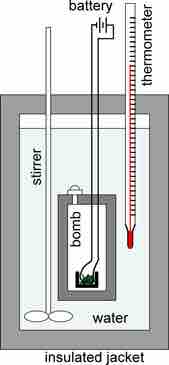 A schematic representation of a bomb calorimeter used for the measurement of heats of combustion. The weighed sample is placed in a crucible, which in turn is placed in the bomb. The sample is burned completely in oxygen under pressure. The sample is ignited by an iron wire ignition coil that glows when heated. The calorimeter is filled with fluid, usually water, and insulated by means of a jacket. The temperature of the water is measured with the thermometer. From the change in temperature, the heat of reaction can be calculated.