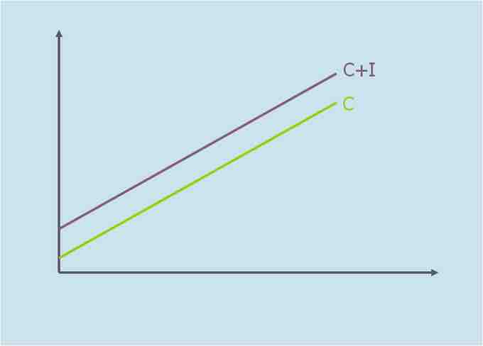 This graph shows the classical aggregate expenditure where C is consumption expenditure and I is aggregate investment. The aggregate expenditure is the aggregate consumption plus the planned investment (AE = C + I).