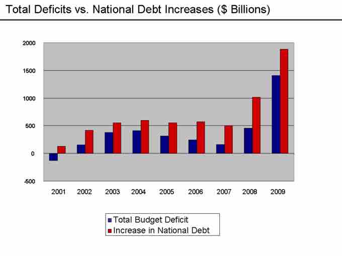 This graph shows the debt increases in the United States from 2001-2009. Positive economics would provide a statement saying that the debt has increased. Normative economics would state what needs to be done in order to work towards resolving the issue of increasing debt.