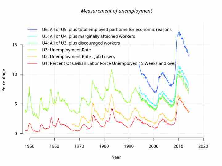 The U.S. Bureau of Labor Statistics uses six measurements when calculating the unemployment rate. The measures range from U1 - U6 and were reported from 1950 through 2010 . They calculate different aspects of unemployment. The measures are: