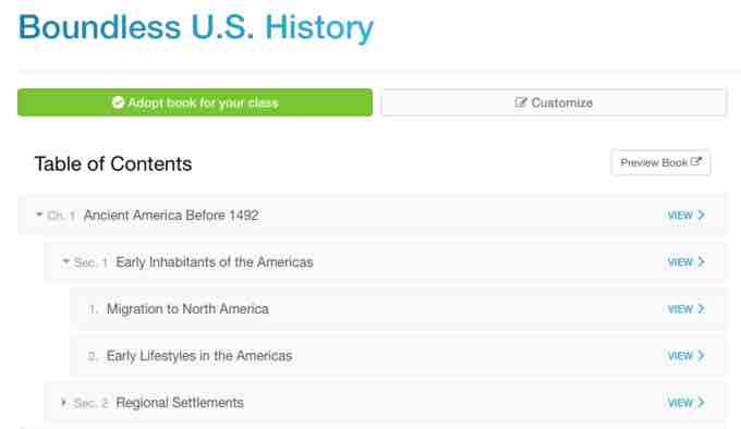 A screenshot of the Boundless table of contents for U.S. History, demonstrating the chapter-section-concept structure and numbering.