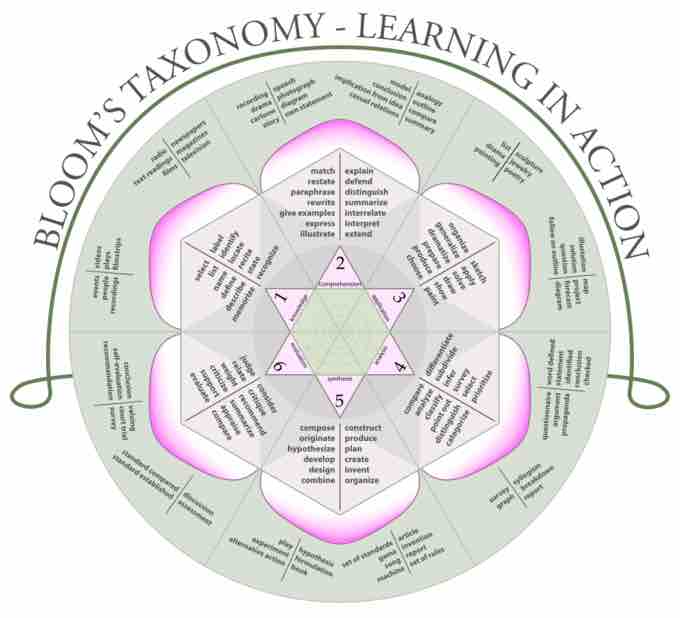 The Bloom's levels: 1. Knowledge 2. Comprehension 3. Application 4. Analysis 5. Synthesis 6. Evaluation
