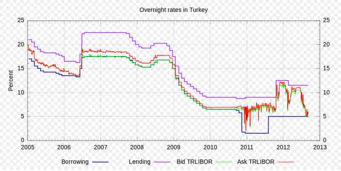 Overnight rates in Turkey are estimated to fall in 2013, indicating a loosened monetary policy.