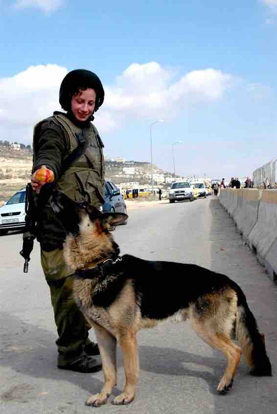 This soldier reinforces her dog's desirable behavior by giving it a treat.