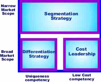 Porter simplified the scheme by reducing it to the three most effective strategies: cost leadership, differentiation, and market segmentation (or focus). He characterizes each as the following: