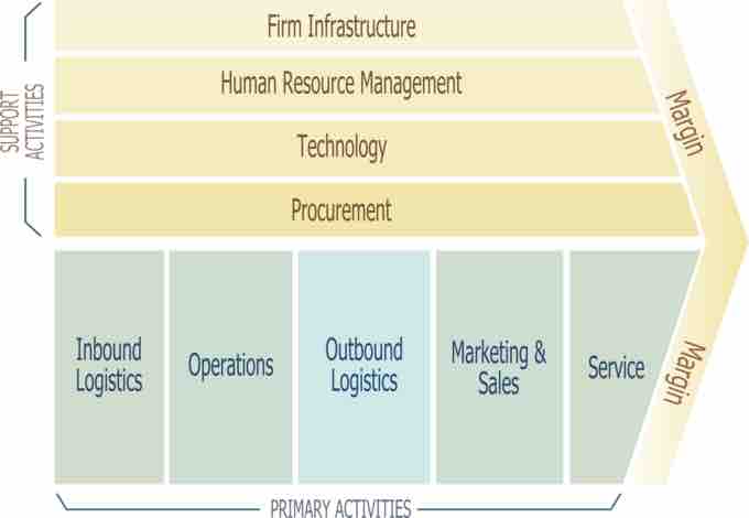 This model, created by Michael Porter, demonstrates how support and primary activities add up to potential margins (and potential competitive advantage). Support activities include HR management and technology; primary activities include operations, marketing and sales, and service.