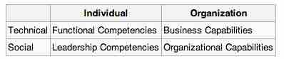 At the intersection of the individual and the technical, employees bring functional skills and competencies such as programming, cost accounting, electrical engineering, etc. At the intersection of the individual and the social, leaders also have a set of competencies or skills such as setting a strategic agenda, championing change, and building relationships. At the intersection of the organizational and the technical are business capabilities. For example, a financial service firm must know how to manage risk and design innovative products.