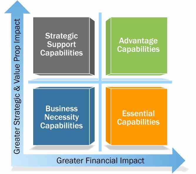 Different capabilities have different financial and strategic impacts. Some capabilities directly contribute to the customer value proposition and have a high impact on company financials. These "advantage capabilities" are shown in the upper right.