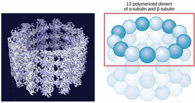 Microtubules are hollow, with walls consisting of 13 polymerized dimers of α-tubulin and β-tubulin (right image). The left image shows the molecular structure of the tube.