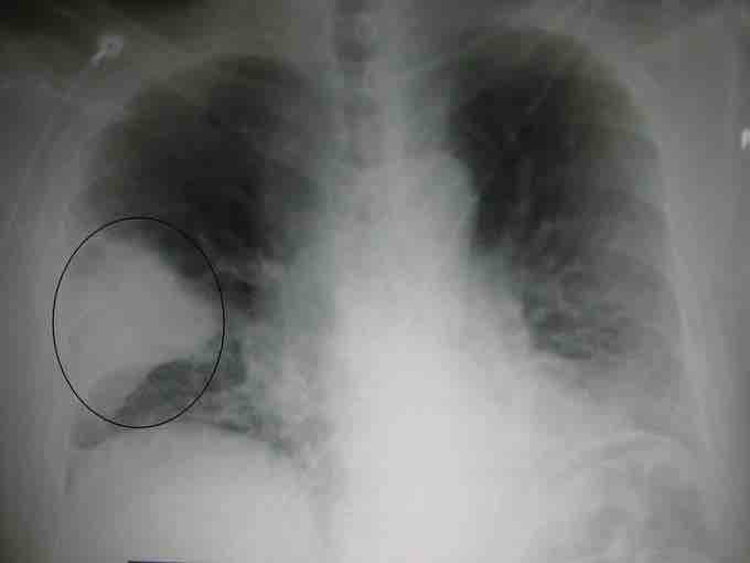 A chest X-ray showing a very prominent wedge-shaped bacterial pneumonia in the right lung.