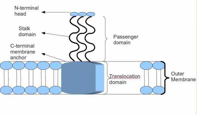The structure on the top (outside) of the outer membrane is a TAA protein. Various parts of the TAA are labelled, including the N-terminal head, stalk domain and C-terminal membrane anchor.