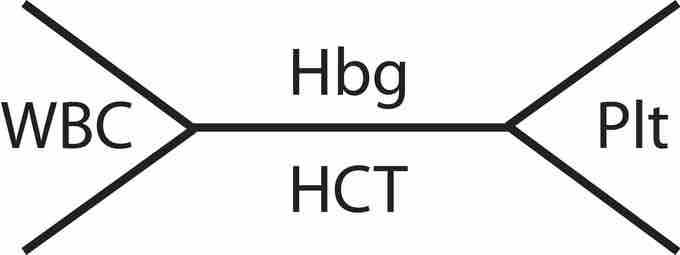 Schematics (also called "fishbones") of shorthand commonly used by clinicians for complete blood count. The shorthand on the right is used more often in the U.S. Hgb=Hemoglobin, WBC=White blood cells, Plt=Platelets, Hct=Hematocrit.